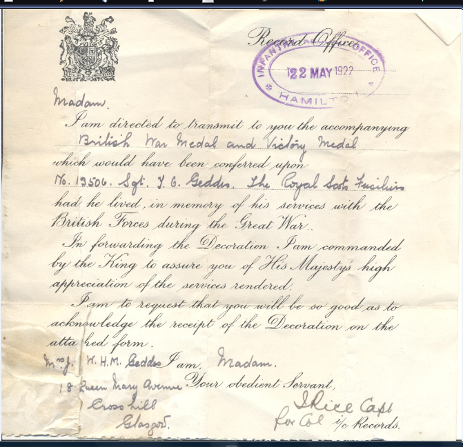 Listed on Glasgow Roll of Honour: Sergeant Thomas O. Geddes, Royal Scots Fusiliers, 18 Queen Mary Avenue.