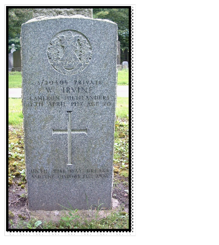 William Irvine, Private, 7th Battalion, Cameron Highlanders, No. S/20406. Died of Wounds 12th April 1917